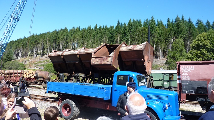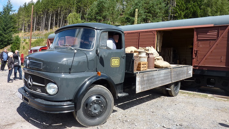 Um 12:00 erreichten wir unseren Zielort. Hier gab es auf dem Historischen Bahnhofsfest einiges zu sehen. Die IG Dreiseenbahn gab sich sehr viel Mühe, historischen Güterverkehr der 50er und 60er Jahre originalgetreu vorzuführen. Hierbei gab es nicht nur die passenden Eisenbahnfahr-zeuge zu sehen, sondern auch sonstiges „Zubehör“ wie Lastwagen, Seilbagger, Laderampen, Gleiswaage und Arbeiter in epochegerechter Kleidung. So wurde beispielsweise das Entladen von Stückgut gezeigt.
