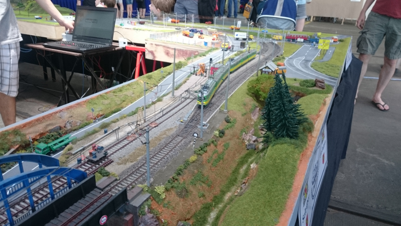 Handreglern die Straßenbahnmodelle auf ihrer Fahrt über die Ausstellungsanlage begleitet werden. Auch die Steuerung der Modelle