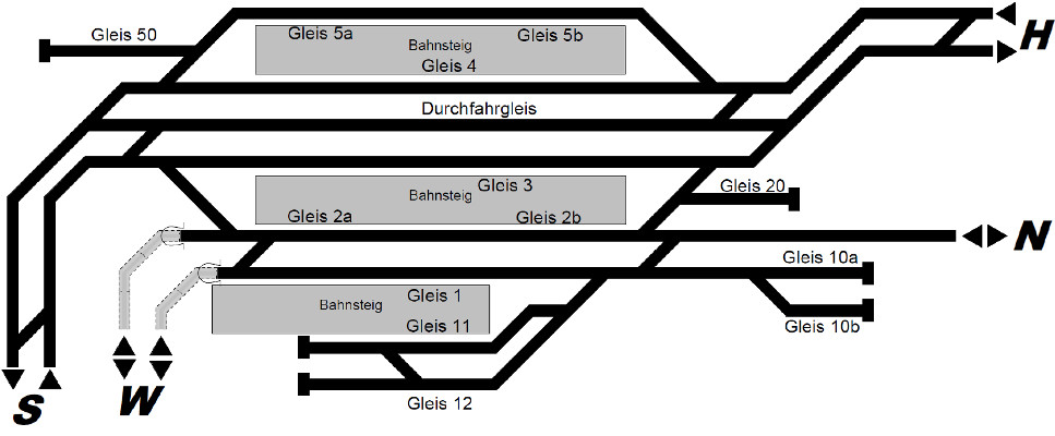 von/nach der Nebenstrecke (N). Gleis 12 dient dabei als Umfahrgleis zum Umsetzen von Lokomotiven im Gleis 11.
