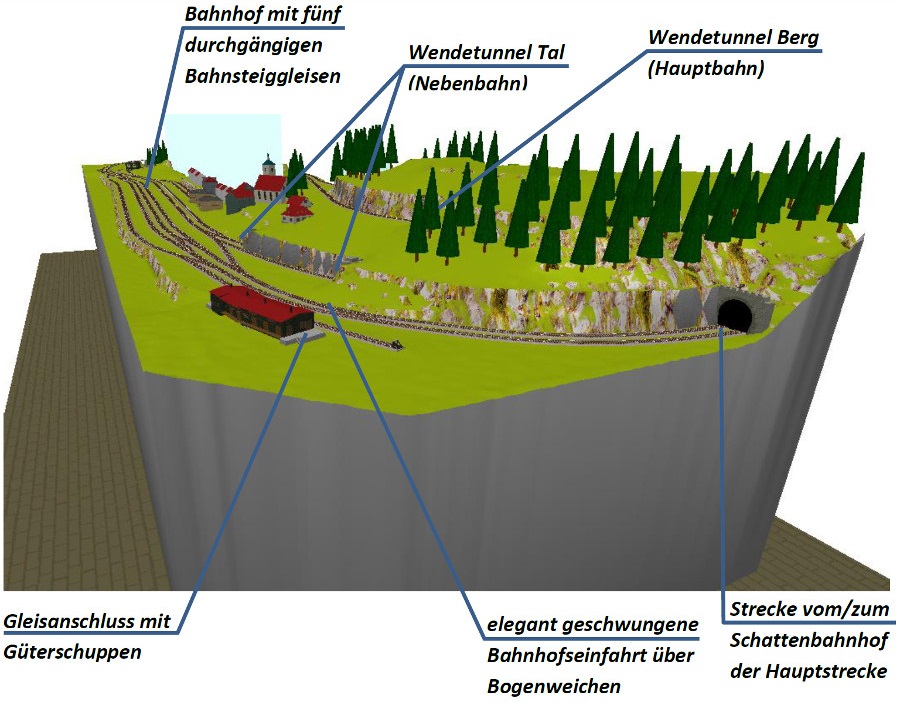 Gegenrichtung), um wieder über ein Gefälle durch einen Gleiswendel in den unter der Anlage gelegenen Schattenbahnhof (S) zu gelangen.