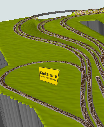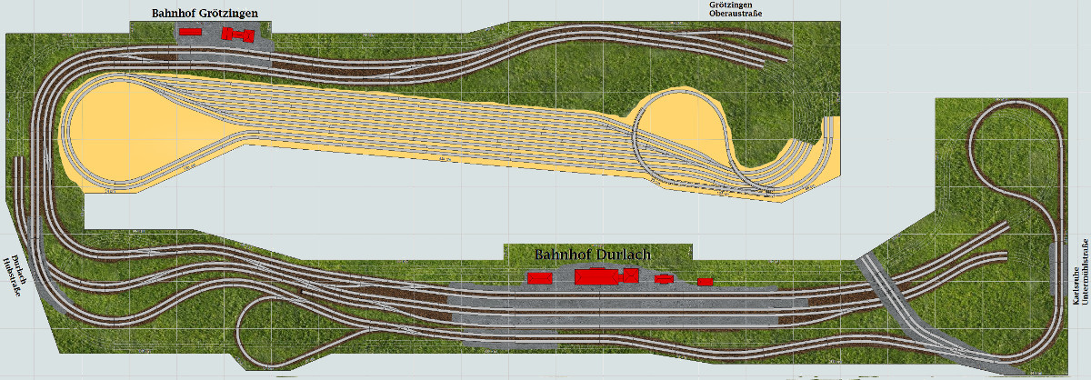 Der nachfolgende Entwurf beinhaltet weitestgehend die gleichen Motive, die die alte Clubanlage enthielt, also die Bahnhöfe Grötzingen und Durlach, sowie die Bahnstrecken nach Heidelberg, Pforzheim und Heilbronn.